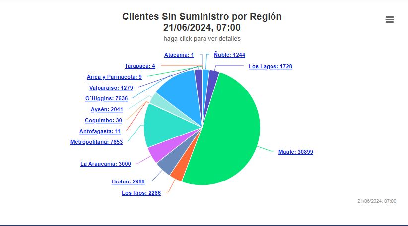 La región más afectada es Maule, con 30,899 personas sin electricidad. Le siguen las regiones de O’Higgins y Metropolitana, con 7,636 y 7,653 clientes sin luz, respectivamente.