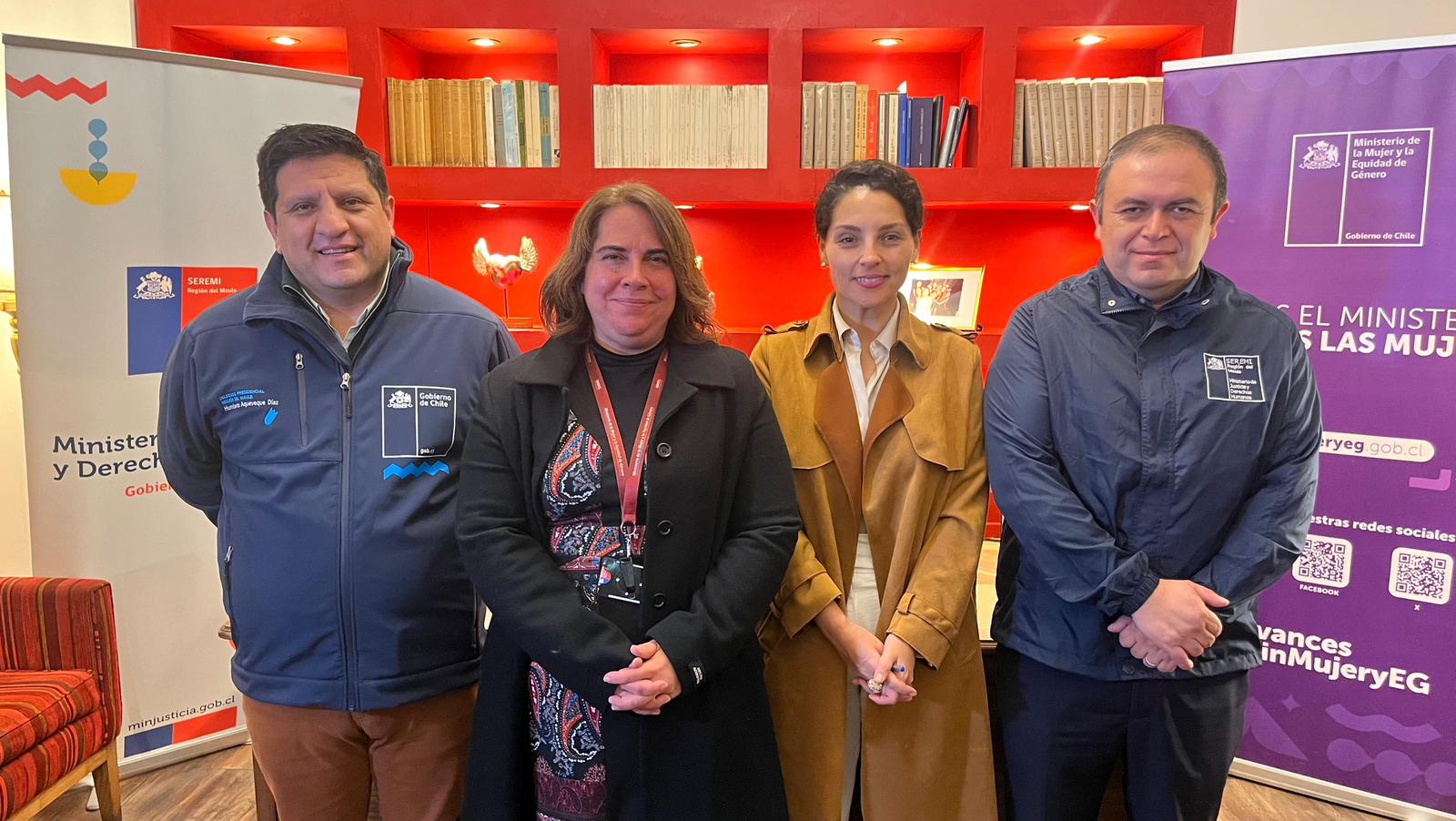 El delegado Presidencial regional, Humberto Aqueveque, en compañía del seremi de Justicia, José González; su par de la Mujer, Claudia Morales y notaria titular de la Tercera Notaría de Talca, Angelita Ormazábal, entregaron balance del primer año de la Ley de Responsabilidad Parental y Pago Efectivo de Pensiones de Alimentos.