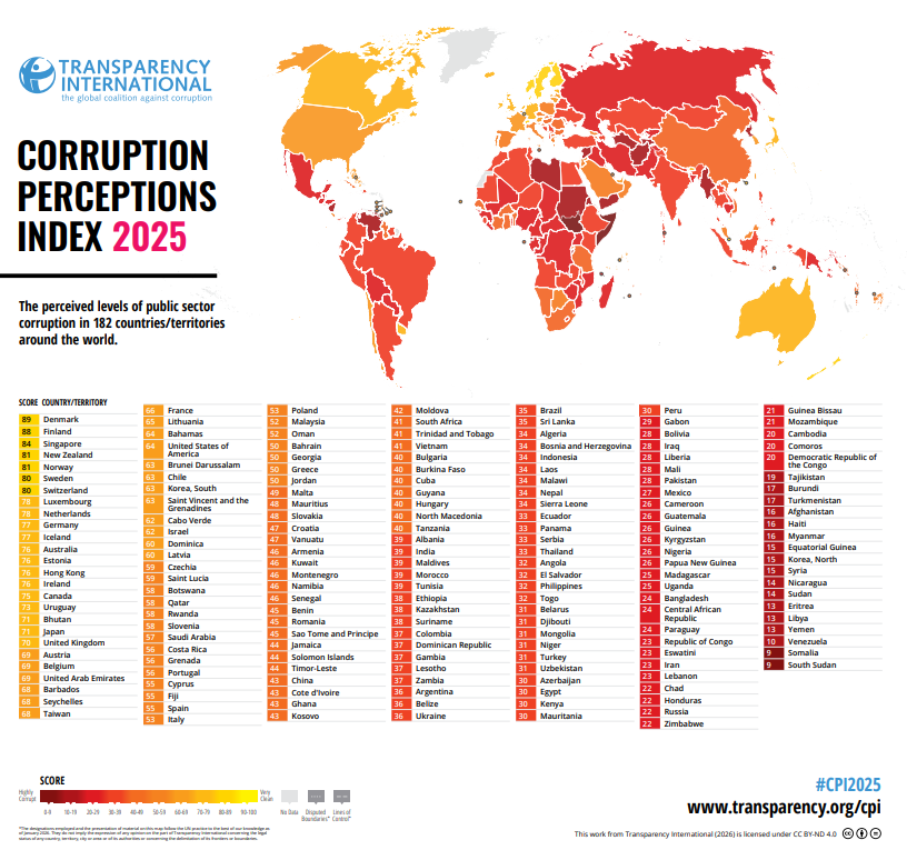 El Índice de Percepción de la Corrupción 2025 revela el peor promedio global en más de una década y alerta sobre el debilitamiento de los controles democráticos.