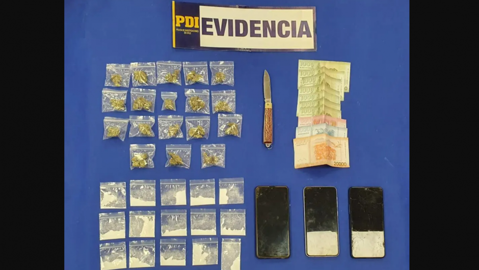 La comisaria Pamela Videla de la BIRO de Valdivia señaló que, al momento de revisar las pertenencias del imputado, los detectives encontraron 18 contenedores de cannabis sativa, 15 contenedores de Clorhidrato de Cocaína, dinero en efectivo y un cuchillo tipo navaja.