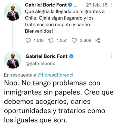 “Qué alegría la llegada de migrantes a Chile. Ojalá sigan llegando y los tratemos con respeto y cariño”, fueron las palabras que el actual mandatario escogió en febrero del 2018 para fijar posición en Twitter respecto a la migración, conflicto que entonces ya mostraba una de sus primeras crisis. Entonces, y ante una duda de un usuaria de la red social Twitter, respondió enfático “No tengo problemas con los inmigrantes sin papeles. Creo que debemos acogerlos, darles oportunidades y tratarlos como los iguales que son”.