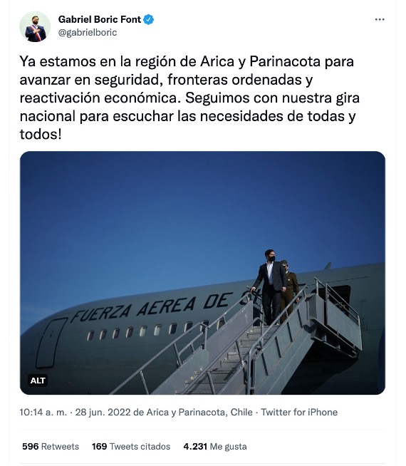 3 años después, y ahora como Presidente de Chile, aterrizó en Arica, para abordar entre otros conflictos el de la migración. Utilizando la misma red social, dijo “ya estamos en Arica y Parinacota para avanzar en seguridad, fronteras ordenadas, y reactivación económica”, fueron sus palabras.