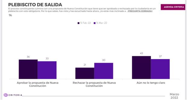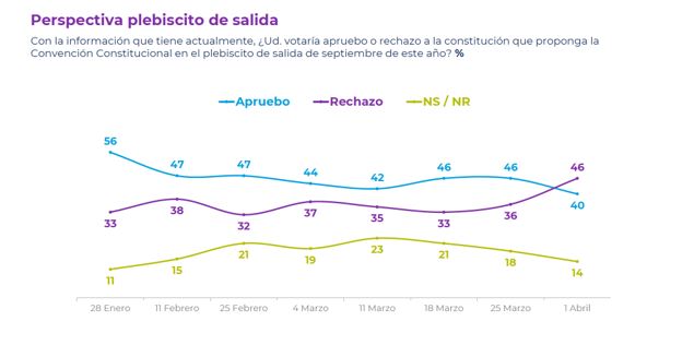Sin embargo, las últimas mediciones han sido categóricas en marcar un punto de inflexión, dándole evidente ventaja al Rechazo por sobre el Apruebo. Hipótesis para explicar la baja en la adhesión a la opción del Apruebo hay varias, entre ellas, la rapidez con la que se han difundido algunos articulados que estarán presentes en la versión definitiva que se presentará a la ciudadanía el próximo septiembre, incluyendo una falta de definición sobre la propiedad de los fondos de pensiones, y otros relativos a diversos sistemas de justicia, distinto para personas de pueblos originarios en relación al resto de los ciudadanos.