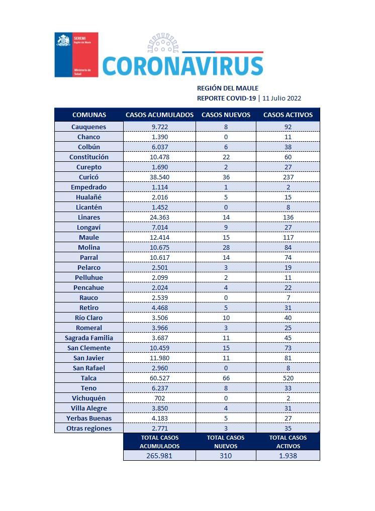 En un nuevo informe sobre la situación del Covid-19 en el Maule, desde la Seremi de Salud expusieron que en las últimas horas se registraron 310 nuevos casos, de los cuales, 231 presentaron síntomas y 73 fueron asintomáticos. Lo anterior, deja un total de 265.981 personas diagnosticadas con la enfermedad en la región desde que comenzó la pandemia. Con respecto a los fallecidos, se contabilizaron tres nuevos decesos, por lo que la cifra total de muertos asciende a 2.981.