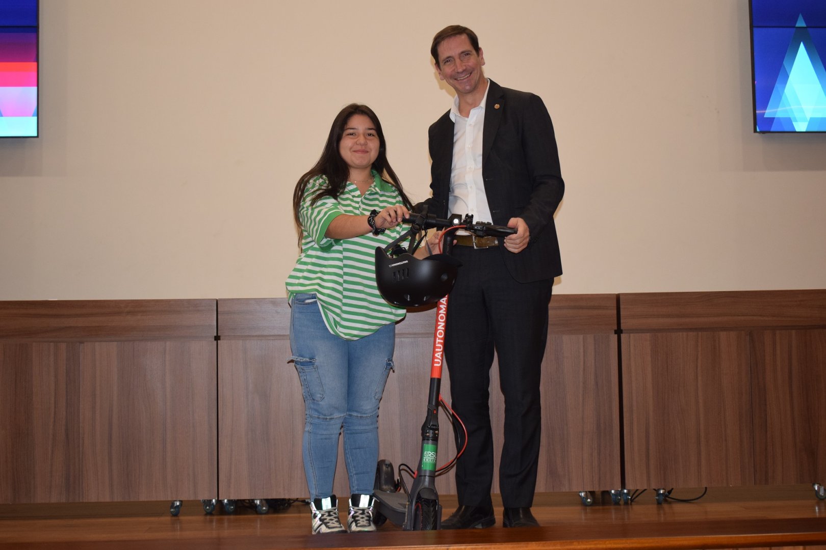 Por su parte, el Director Corporativo de VidaUA, Ignacio Osorio, destacó que la institución ha apoyado a más de 200 jóvenes con estas becas en las sedes de Talca, Temuco y Santiago, reconociendo el esfuerzo realizado por ellos durante toda la etapa de enseñanza media. “Esta beca no tan solo viene a acompañar académicamente a los estudiantes con un notebook, sino que también nos permite como universidad hacernos responsables del cuidado del medio ambiente con la entrega de un scooter, así es que estamos muy felices de acompañar a los estudiantes de Talca en este reconocimiento”, precisó.
