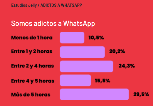 “Las cosas son así. WhatsApp se instaló en el centro del santo grial de todo lo que hacemos: trabajo, conversaciones con amigos y familia. Es un lugar para compartir desde memes a noticias. Y para comunicarnos. Más del 43% prefiere usar llamadas a través de esa plataforma de mensajería antes que llamar por teléfono. Decir que somos adictos a WhatsApp sería quedarnos cortos”, detalló el director ejecutivo de Jelly, Manu Chatlani.